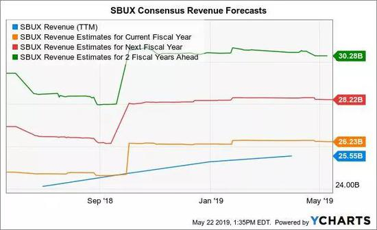 市场普遍预计,到2021财年,星巴克的营收将从过去12个月的256亿美元增至303亿美元,较2019财年增长20%,或复合年增长率为7.5%。根据粗略的计算,我估计星巴克在未来2.5年内还需要在世界范围内再开设5000多家分店。我认为,这些预测的风险不仅来自我对中国经济走弱的看法,也来自美国等成熟市场。
