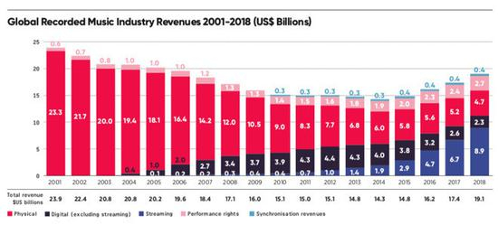 看看苹果涉足期间全球唱片业的历史收入情况吧。2001年苹果推出iPod的时候,唱片业几乎全部收入都是来自于实体媒体,大部分都是CD。苹果用iTunes统治了数字下载的崛起,然后用Apple Music转型成为流媒体的主流玩家。在整个期间苹果不仅实现了下载和流媒体服务的盈利,而且通过销售iPod以及后来的iPhone,最近的Apple Watch、AirPod、HomePod与Beat获得了重大的硬件利润——这些基本上都是由听音乐的人推动的。