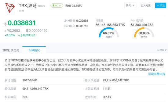 “波场TRON”是孙宇晨于2017年创立的区块链项目。根据宣传资料,波场TRON是基于区块链的去中心化内容协议,其目标在于通过区块链与分布式存储技术,构建一个全球范围内的自由内容娱乐体系,这个协议可以让每个用户自由发布,存储,拥有数据,并通过去中心化的自治形式,以数字资产发行,流通,交易方式决定内容的分发、订阅、推送,赋能内容创造者,形成去中心化的内容娱乐生态。