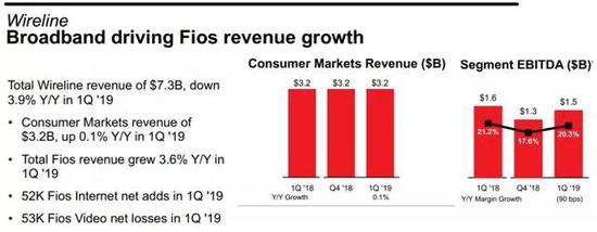 在第一季度,Fios 互联网收入的增长刚好抵消了视频业务的亏损。 从运营数据来看,Fios Video 对 Fios Internet 客户的比例从2018年第一季度的78% 下降到了第一季度的72% 。 这意味着越来越多的消费者选择只使用互联网服务和电视套餐。 即使 Fios 互联网可能会是一个更强大的产品,并继续增长,潜在的加速下视频流失可能超过任何积极的 Fios 互联网数字。