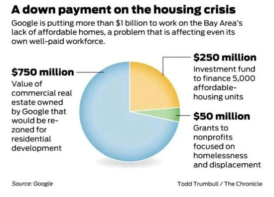 首先,他们并没有拿出十亿现金。整体计划中有 7.5 亿是通过土地价值呈现的,而土地则是 Google 租给开发商使用,并不是无偿奉献的。至少从目前披露的情况来看,开发商租走之后想要做成什么价位什么密度的住宅并不会被过问,他们完全可以按照政策的最低限度建造可负担住房而把大部分建设成中等以上收入阶层需要的富人区。