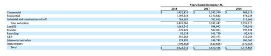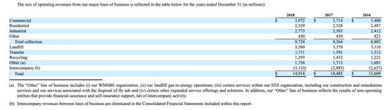 从WM2018年的年报可以看出,其收集业务占营收大部分,商业和工业领域的收集营收比重也较大。