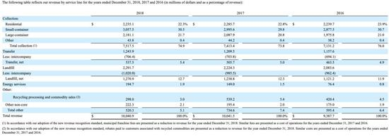 2018年,WM年收入为149.14亿美元,净利润为19.2亿美元,其中,收集业务占总营收的65%,为97.2亿元。公司在美国和加拿大地区为市政、商业、工业及居民客户提供废品管理服务,包括收集、垃圾填埋(固体和危险废物)、转运、再利用和资源回收服务。截至2018年12月31日,WM有大约43400名全职员工。