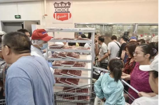和海岸君不同,叔叔阿姨们在上述区域几乎没有停留,而是推着大号购物车直奔日用品和生鲜食品区。牛肉、鸡肉、海鲜、熟食、面包等区域简直是水泄不通,推着购物车进出绝对考验人。因此不少结伴而来的市民选择分头协作,一个人在角落看守购物车,其他几人分头到热门区域抢东西。