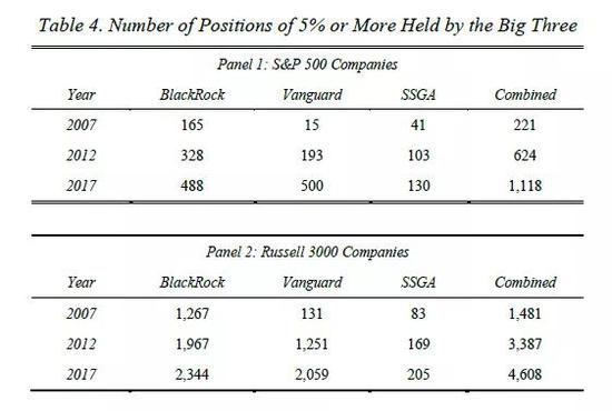 另一种描绘三巨头持续而显著增长的方法是,考虑一下三巨头持股5%或以上公司的数量。表4分别显示了2007年、2012年和2017年,标普500指数和罗素3000指数成分股公司中,三巨头持股比例不低于5%的公司数量。