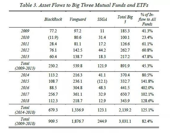表3整理了2009-18年三巨头的资产流动情况。2009-18年,流入三巨头的总资金超过3万亿美元,占同期所有流入主动和被动型基金总资金的82%。三巨头作为资金流入目的地的主导地位,自然地反映在这一时期三巨头的增长中。