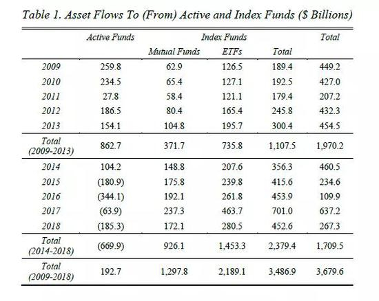 表1显示了从2009-18年10年间,流入 (和流出) 主动管理型投资基金和指数型投资基金的资产。如表1所示,过去10年,相比于主动型基金,流入指数基金的资金一直占据主导地位。从2009-18年,流入主动型基金的资金总额不足2000亿美元——因为过去5年中,大量资金流出,抹去了第一个5年流入的大部分资金。相比之下,同期流入指数基金的资金总额超过3.4万亿美元,是流入主动型基金的18倍。在那10年里,指数基金的资金流入一直保持正值,而且随着时间的推移还在增加:2014-18年的平均资金流入为每年4760亿美元,是2009-13年 (平均每年2215亿美元) 的两倍多。