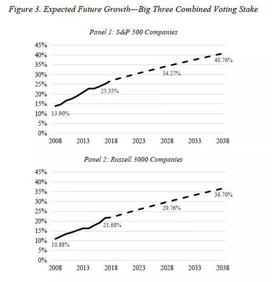 从过去的趋势推断,我们已经证明了三巨头在未来二十年将成长为“超级三巨头”的可能性。在这种“超级三巨头”的情景下,它们将在大多数美国上市公司的投票中占据主导地位,在标普500指数成份股公司中,平均投出40%的选票。从这一分析中,决策者得到的明确信息是,应该认真对待“超级三巨头”的情景及其对公司治理格局构成的挑战。