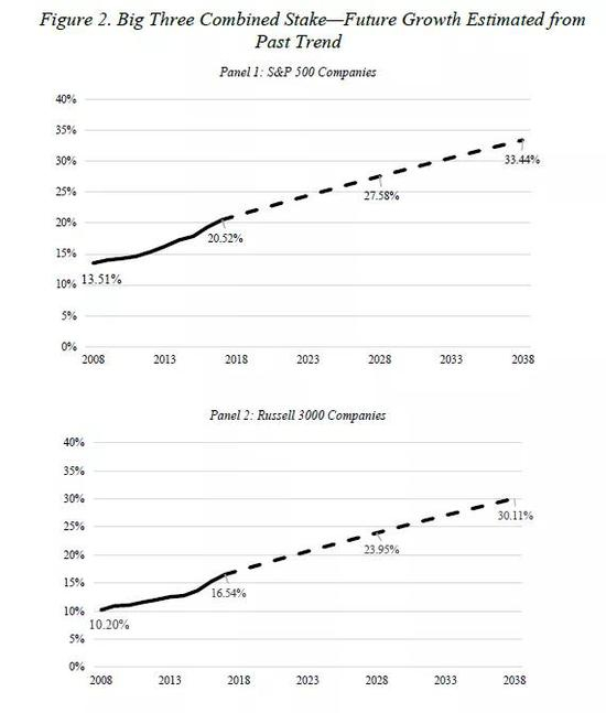 鉴于过去20年三巨头持股比例的稳步上升,政策制定者、研究人员和市场参与者自然会问,如果这种增长趋势延续下去,结果会如何。本部分根据有关最近趋势的证据提供了一些估计。