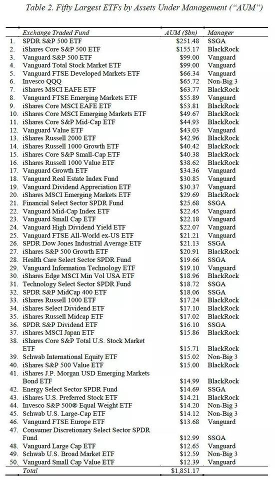 表2整理了50个最大的股票ETF。这些ETF总共管理着超过1.8万亿美元的资产,其中最大的ETF——SPDR S&P 500 ETF——持有超过2500亿美元的资产。50只最大的ETF由贝莱德、先锋领航和道富环球所主宰,分别管理着50大中的20只、16只和9只。仅有5只 (前30大ETF中也只有1只) 是由三巨头以外的基金管理的。