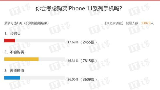 在iPhone 11系列发布之后,IT之家进行了针对iPhone 11是否会购买的意愿调查,现在统计结果已经出炉,一起来看一下吧。