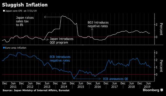 将欧洲央行和日本央行进行比较,德拉吉在2014年开始负利率,2015年开始量化宽松,日本央行在2016年将利率降至零以下。它们都避免了通货紧缩(物价和工资的螺旋式下降,可能导致经济萧条),但自那以来,尽管政策一直很宽松,通胀却难以获得很大的动力。