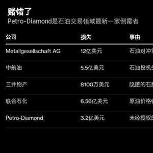 石油市场发生过很多爆仓的故事。1994年,对冲策略失败导致Metallglesellschaft AG亏损12亿美元。2004年,中航油石油投机巨亏5.5亿美元。