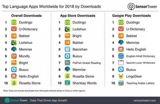 目前,U-Dictionary已成为印度尼西亚、秘鲁、墨西哥、哥伦比亚、埃及GooglePlay教育榜第一。SensorTower的数据显示,2018年全球语言类App下载量榜单排名,U-Dictionary在下载量总榜与Google Play下载量排行榜上均排名第二,仅次于老牌产品Duolingo。