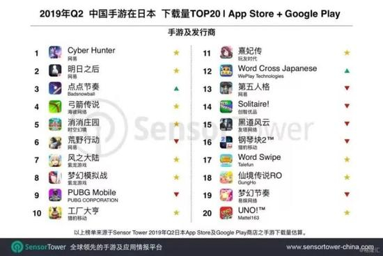 同样是Sensor Tower的数据,2019年Q2中国手游在日本收入Top20的产品中,网易4款入围,《荒野行动》第一、《第五人格》第八、《明日之后》和《率土之滨》日服(大三国志)分别为第十五、十七。