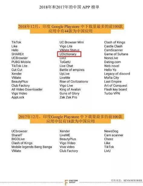 截至2018年年底, 印度GooglePlay Store移动应用Top 100(涵盖不同分类)的App中,中国App就占了44个,U-Dictionary便是其中一款。