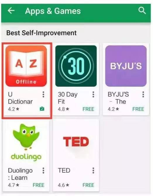 在登陆印度市场仅数月内,U-Dictionary还在“Best Self-Improvement”细分榜单中名列第一,超过了在全球备受欢迎的TED与语言学习工具Duolingo(多邻国),同时也领先印度本土的学习App:BYJU‘S。