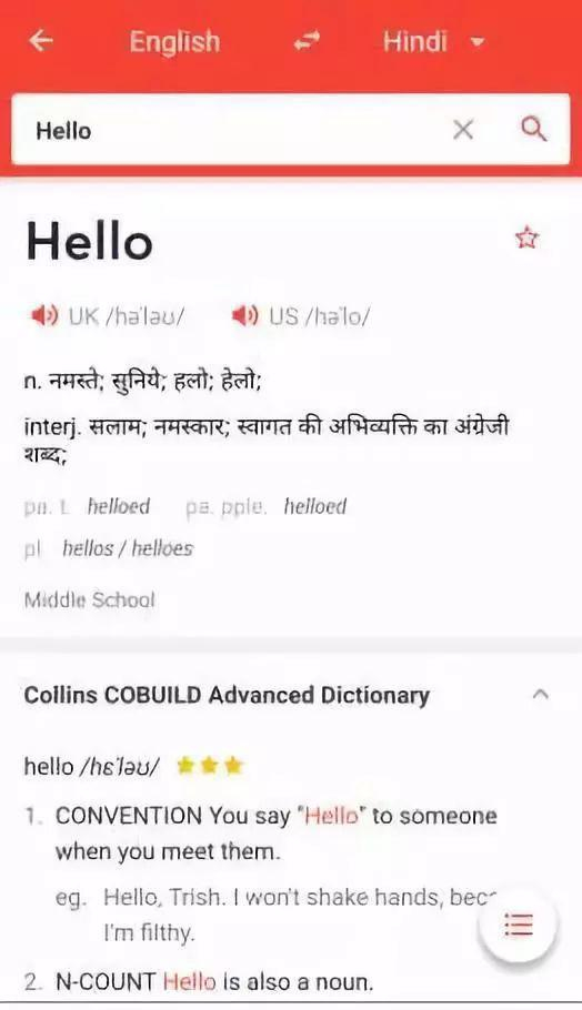 此外,根据印度的语言文化环境和用户偏好,U-Dictionary做了本地化功能开发。比如,U-Dictionary考虑到用户可能遇到的文字输入障碍,App应用了谷歌语音识别技术,能较为准确地辨识十几种语言,支持离线发音、双语例句。