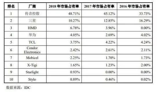 传音控股称,2018 年公司手机出货量1.24 亿部。IDC的数据显示,传音以48.7%的市占率“横扫”非洲手机市场,高居榜首。传音的招股书则显示,2016-18年,该公司在非洲市场的收入占比分别达到88.62%、76.86%、77.30%。
