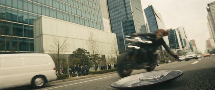 她骑着它从飞机上跳下来,在城市车群中穿梭,炫技一般地驾驶摩托车贴地骑行,然后把盾牌传递给美国队长。