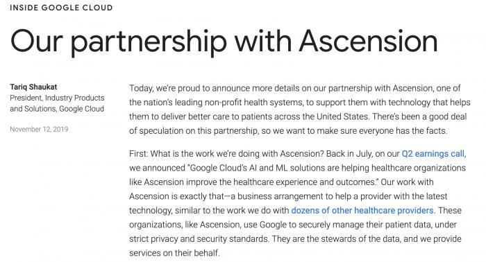报道发出后,阿森松集团和谷歌迅速发布了新闻稿,正式宣布了双方的这一合作,并强调了行为的合法性,称这项合作旨在帮助医疗机构更好的帮助患者,并没有违反美国1996年颁布的《健康保险便利和责任法》(HIPAA)在内的各项医疗法规。