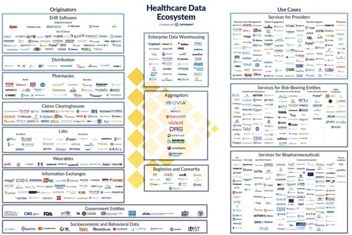 正如上图所示,更有几百上千个生态体系上的中小型公司,构成以医疗数据的收集方(比如可穿戴设备, 数据交易平台、软件提供商等全方位的数据平台。