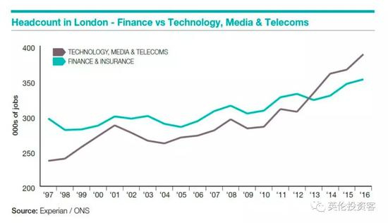可以看出,伦敦TMT从业人数在2013年就超过了金融从业人数,而且这个趋势还在不断扩大。