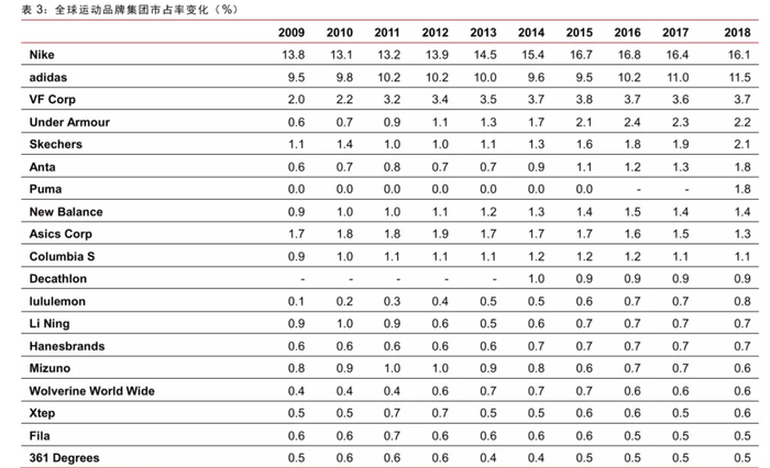 全球运动品牌市占率变化。图片来源:中信证券研究部