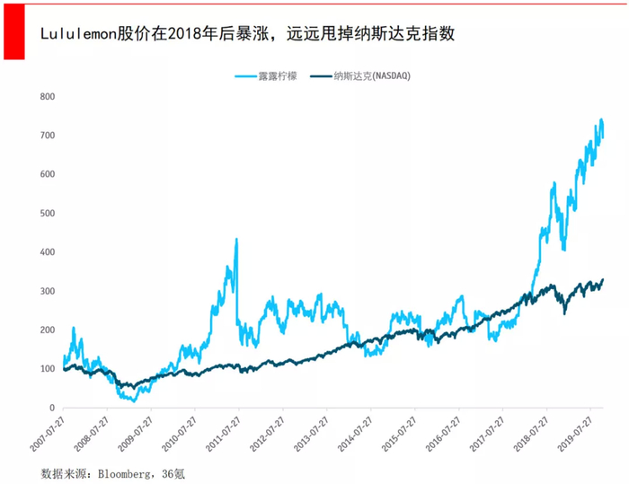 但到2018年,lululemon已经以远高于同行的增速快速增长,创造了十年十倍(1100%)的投资神话,自2018年初以来,lululemon更是上涨了160%。