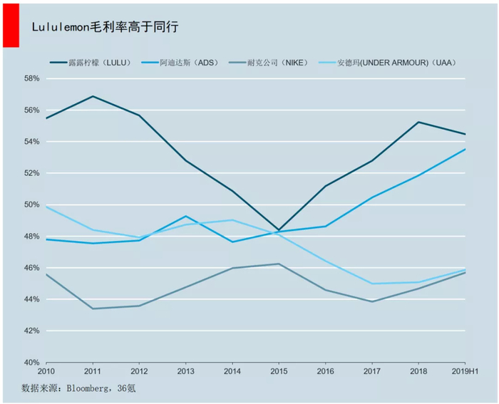 供应链改革的效果明显,使得资本市场没有放弃lululemon,迎来了估值修复。公司毛利率自2015年的最低点48.39%触底反弹,在2018年恢复到历史较高水平。
