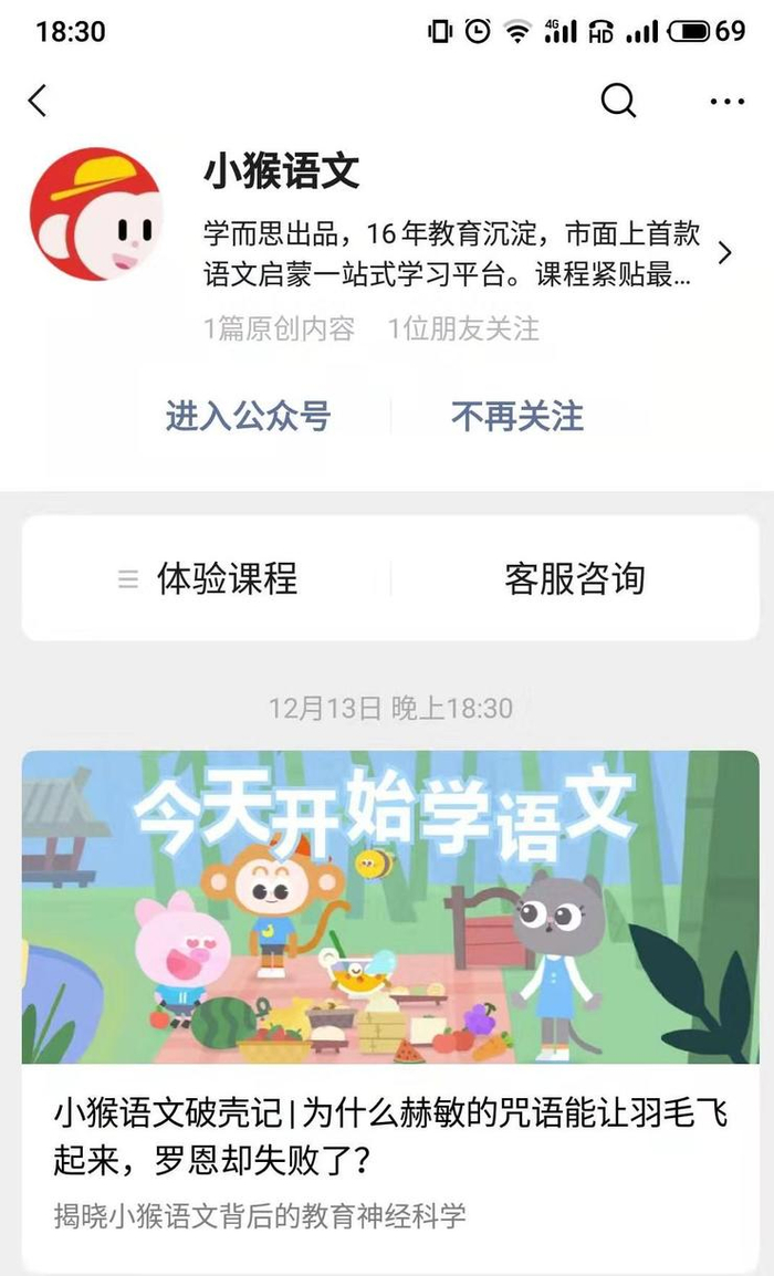 据官方微信公众号显示,小猴语文的课程内容包括汉字、拼音、国学、阅读、表达五大知识,课程形式为趣味动画、AI互动视频。据其介绍,小猴语文的动画视频由原迪士尼动画团队打造,还设置了闯关答题、语音录入等环节,让孩子在游戏互动中完成学和练。11月22日,小猴语文官微推送了首条消息,12月8日,小猴语文启动宣传,如今正在微信公众号上大力售卖49元10节试听课。官微显示,小猴语文首期试听课已结束,第二期将于12月23日开课。