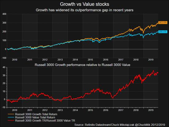 Netflix的增长带动下,过去十年来个股的表现也反映出了投资者对成长型股票的偏爱。Netflix在12月19日收盘时涨幅达到了惊人的4100%。