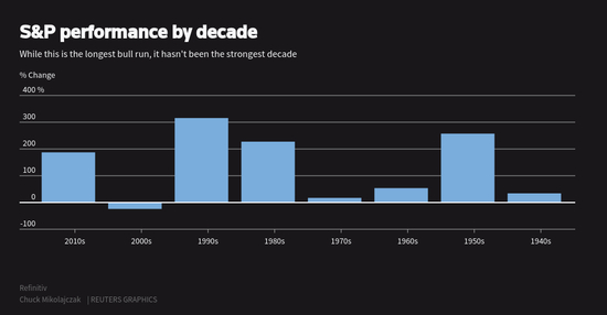 在美联储的宽松货币政策的推动下,标普500指数是过去十年来全球十大经济体中表现最好的基准股票指数。但该指数在2010年代的表现仍不及过去几十年的表现。追溯到1940年代,标普500指数表现最好的时期是在90年代,涨幅达到300%,其次是50年代和80年代,涨幅都超过200%。