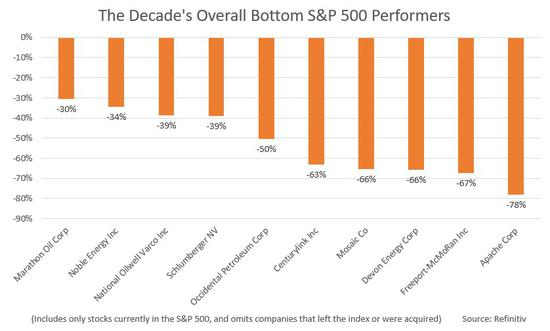 能源股排名垫底,其中Apache表现最差,股价在过去十年里下降了近80%。