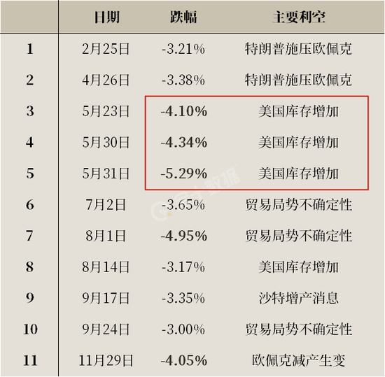值得注意的是,这11次暴跌中,有多达8次是和原油供应面密切相关的,从中也可以看出,相比于需求面,供应面的利空消息对油价打击更为沉重。