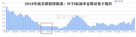 我们不妨先回顾一下去年年底油价情况。去年12月,原油价格抵达年内低点,当时EIA公布2018年最后一份能源展望报告,将2019年的油价预期较11月大幅下调了20%;市场看跌情绪也十分浓厚,CFTC持仓报告显示投机性原油多头合约数在低位徘徊。