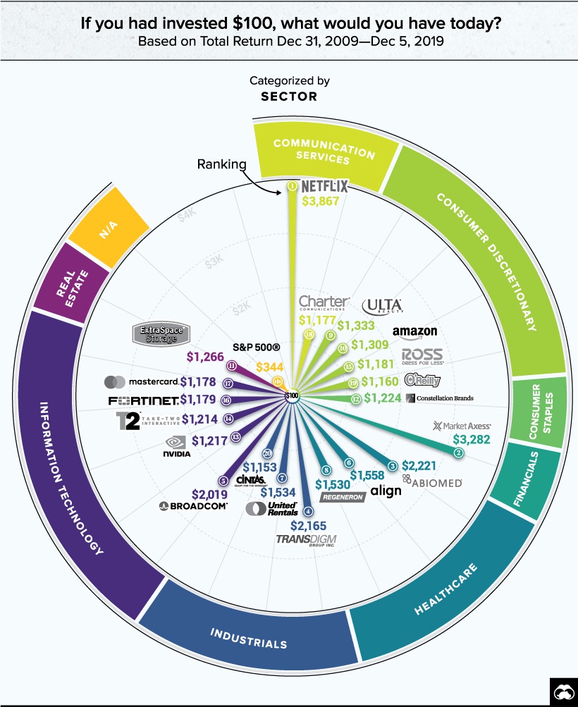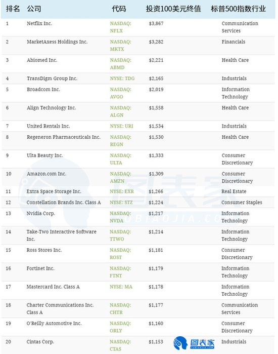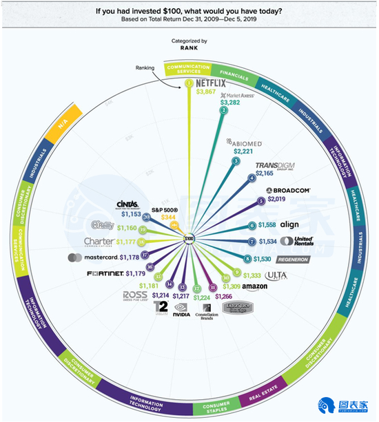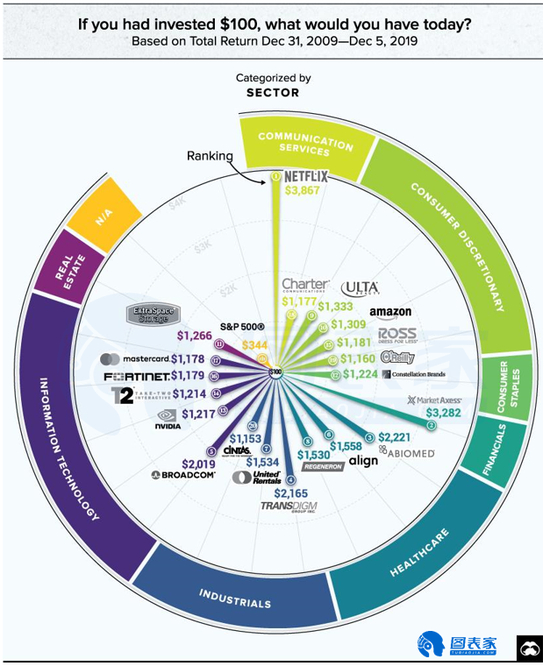 下图显示了过去10年表现最好的股票,并显示了100美元的初始投资在今天的价值。