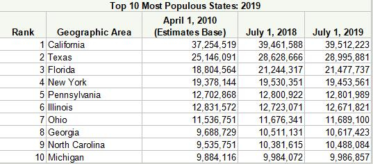 2019年,全美有10州的人口数呈现下滑:纽约州减少7.7万人,伊利诺伊州的登记住户减少5.1万人,另外西维吉尼亚、康涅狄格州、密西西比、夏威夷、新泽西、阿拉斯加和佛特蒙州的登记住户也都减少1.2万人到5千人不等。