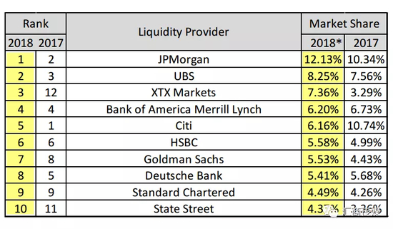 欧洲知名调研机构EuroMoney公布了2019年全球外汇(主要为机构外汇)调查报告结果显示,在全球外汇市场份额中,前三名分别为摩根大通(JPMorgan),市占率9.81%、德意志银行(Deutsche Bank),占比8.41%、花旗银行(Citi),占比7.87%;紧随其后的是非银金融机构XTX Markets(7.22%)和瑞银集团(UBS),占比6.63%。