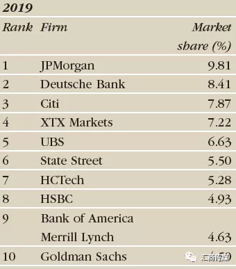 在2019年的交易量排行榜中,进入前十的公司还有,道富银行、HCTech、汇丰银行、美林美银以及高盛。