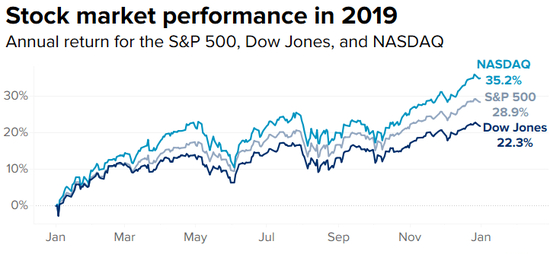 2019年内,道指累计上涨22.34%,标普500指数涨幅为28.88%,纳指涨幅为35.23%。
