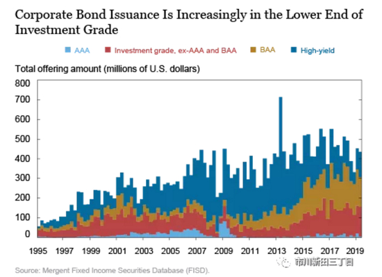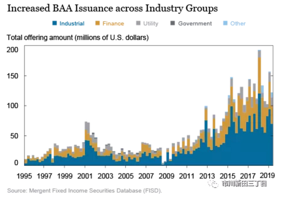 截止到2018年末美国公司债市场的未偿余额为9.2万亿美元,规模与美国按揭质押债券市场不相上下。我们在本文中的观点是,尽管在2008年金融危机后美国公司债市场的大部分发行量来自于投资级债券,但BAA级公司债的大量发行会引发市场对美国金融稳定性的担忧。