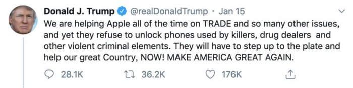 特朗普对此大加指责,在推特上控诉苹果是白眼狼,拒绝解锁杀手、毒贩和其他犯罪分子的手机。