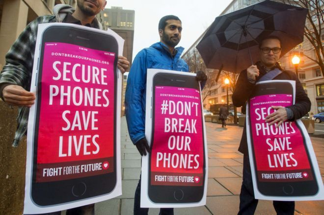 在 2016 年加州枪击案发生时,人们在法院外对苹果保护用户隐私表示支持。