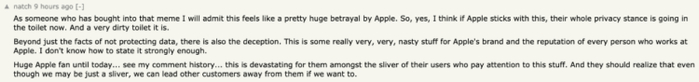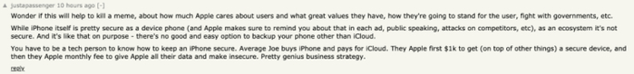 在 HackerNews 上,人们对这一事件展开了热烈讨论,其中有人表示:这让我们对苹果保护用户隐私的印象从此崩塌,虽然 iPhone 还是相当安全的手机,但 iCloud 上的数据不加密,可能意味着从此不再有什么保密的信息了。毕竟 iPhone 和 iCloud 的绑定程度很高,你很难找到其他的替代方式。