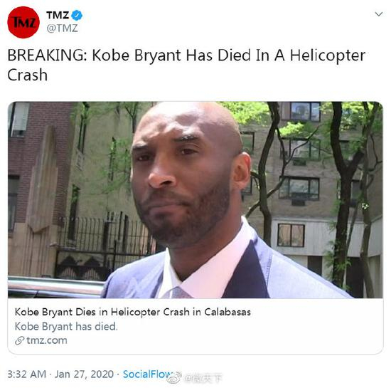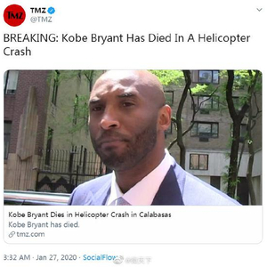 外媒:NBA巨星科比·布莱恩特在直升机坠毁事件中丧生