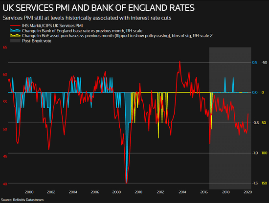 2019年底,劳动力市场疲软的迹象促使英国央行两名利率制定者投票赞成降息。包括行长卡尼在内的另外三位人士最近表示,英国经济可能需要更多的刺激措施。