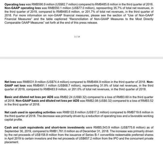 2019年3季度每份美国存托凭证基本和摊薄净亏损为人民币2.24元,2018年第三季度为亏损3.60元人民币。