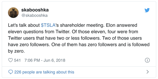 “公众对特斯拉的社会价值存在根本性的分歧,”做空者法赫米·夸迪尔(Fahmi Quadir)说。 她在 Twitter上并不活跃,但是她称赞TSLAQ尽职的民主化调查。“在治理、持续盈利和产品完整性方面,也存在一些问题。”
