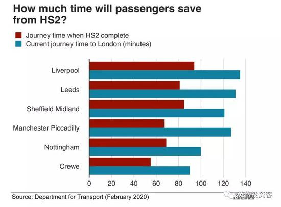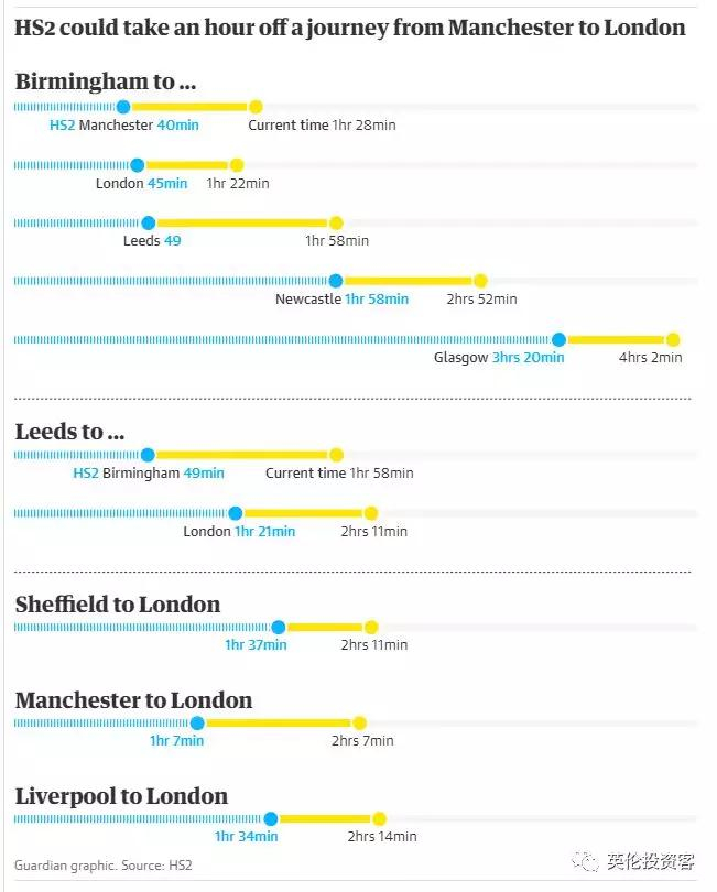 HS2建成后,从伦敦到伯明翰的乘车时间将从目前的82分钟减至45分钟,而伦敦至曼城的乘车时间也将缩短至一个小时。